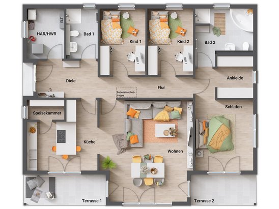 Wir bauen deine eigenen vier Wände genau nach deinem Geschmack: Der Haustyp gibt einen Rahmen, aber die Gestaltung ist ganz dir überlassen. Entscheide dich für den Grundriss, der am besten zu deiner Wohnsituation und deinem Lebensstil passt und erlebe so hohen Wohnkomfort wie noch nie zuvor.